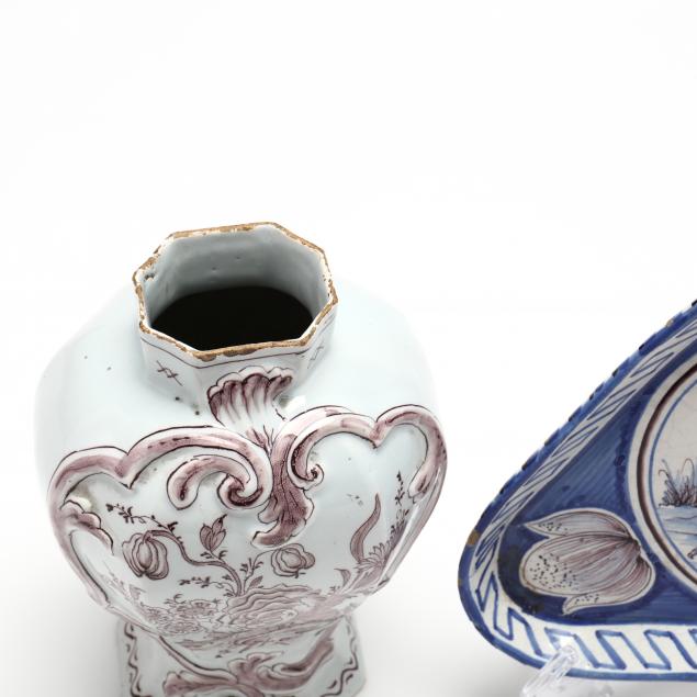 The first is an English Delft structured vase painted in manganese, (8 3/4 in.) (fritting and wear at rims); second a footed triangular tray, possibly Portuguese (1 1/2 x 9 x 9 in.) (edge chips; crazing).