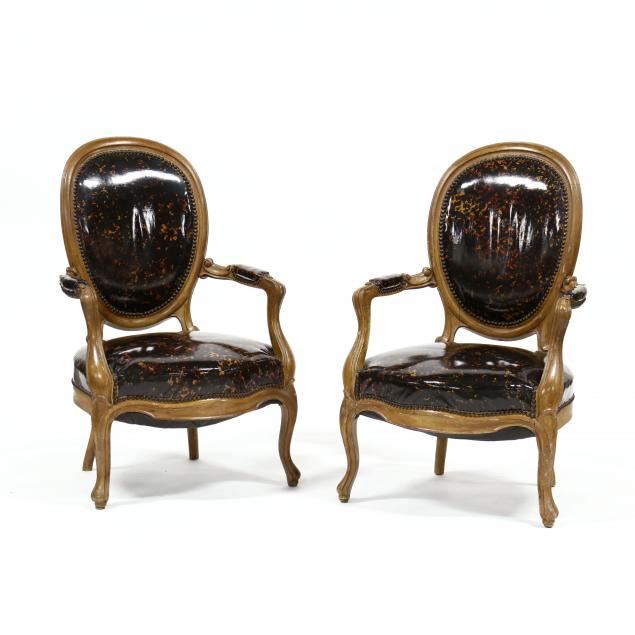 Mid 20th century, wood frames with a brown painted surface, oil cloth upholstery with brass nail head trim.