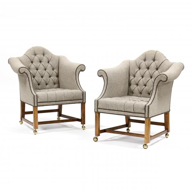 Late 20th century, grey tufted over upholstered frames with rolled arms, shaped back with tufted front and seat, with brass nail head trim on cherry legs with stretcher base and casters, labeled.