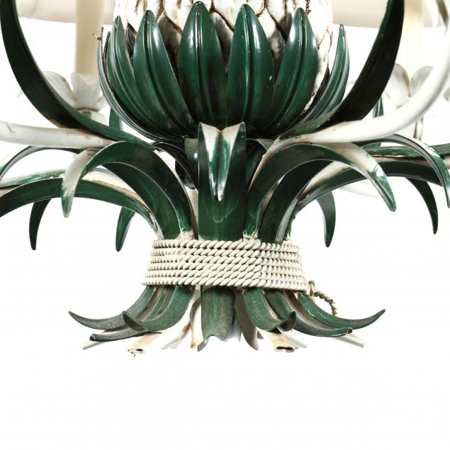 1970s, six light form, painted metal with shades, ceiling cap and chain.
