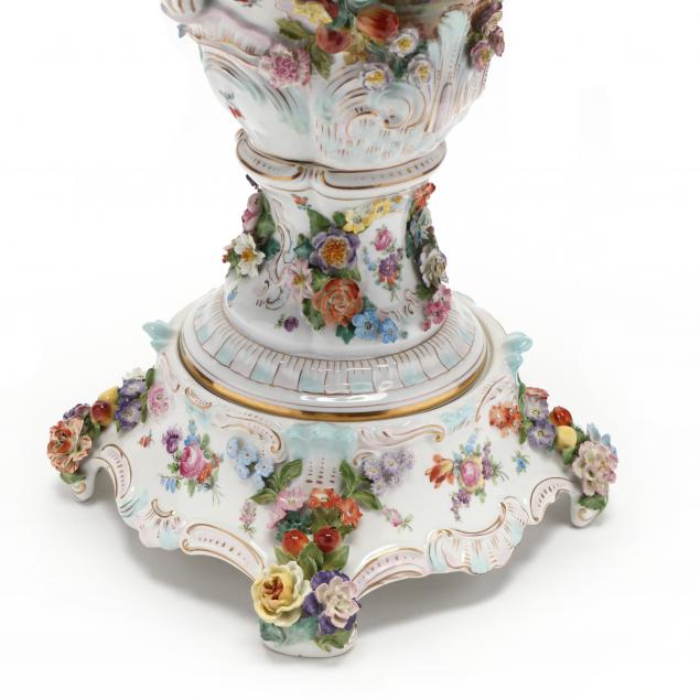 Second half 19th century, flower encrusted with Rococo style handles and stand, the urn is painted on the obverse with a scene of a couple relaxing near a ruin, the reverse painted with a bouquet, the pierced cover is crowned by a 7 1/4 inch tower of flowers, marked on the underside.