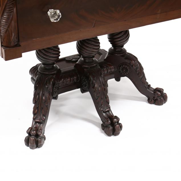 Mahogany veneers, rectangular top above two long drawers with book-matched mahogany veneer, acanthus carved half column stiles, raised on three spiral twist vasiform standards, plinth base with three down-swept acanthus carved legs with front paw feet.