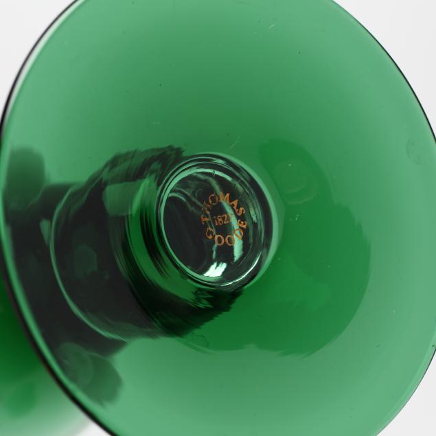 England, late 20th century, each with an emerald green cup on two stacked clear balls with green conical foot, gilt maker's mark to undersides, including (15) water goblets (6.5 in.), and (14) wine goblets (6 in.).