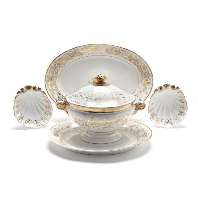 Accessory pieces include: (4) dishes of a shell shape; a fish platter (23 in.) an oval platter (15 in,.); (2) small oval platters; (2) large oval platters (larger 23 in.); a covered tureen with fruit basket finial (DOA 12 x 15 in.). Total (11)