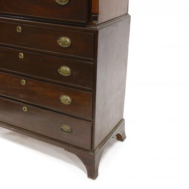 Circa 1800, two part form, oak secondary, applied cove molded cornice with canted corners, the whole consisting of three over seven graduated and cock beaded drawers, the upper case with ebony and fruit wood inlaid faux fluted canted corners terminating in lamb's tongue, raised on slightly down-swept shaped bracket feet with line inlay.