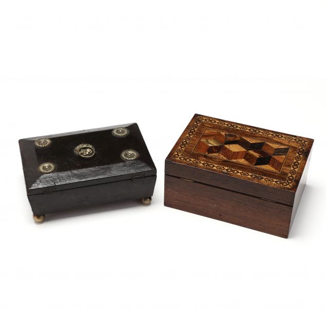 19th century, the first in rosewood veneer, with geometric light and dark wood parquetry inlay. red painted interior (3 1/4 x 7 x 5 in.) ; the second box in pine, encased in leather, with elliptical brass escutcheon, beveled edged lid with four brass rosettes and centered foliate ring finial, opens to a celadon papered interior, on four brass feet (3 x 7 x 4 1/8 in.).
