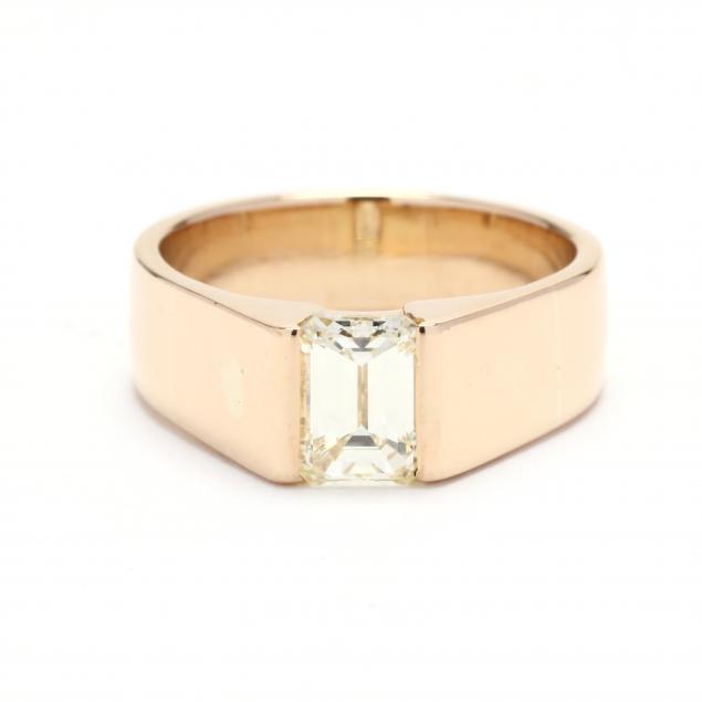 The emerald cut diamond (7.66 x 5.56 x 3.77mm) weighing 1.44 carats (actual) (S -T color, VVS2 clarity) half bezel set to the center in a high polish yellow gold tapered mount stamped 18K.