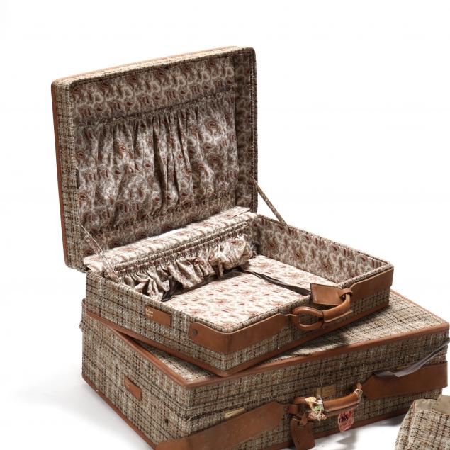Tan leather and tweed including two suit cases, one soft garment bag, and one duffel bag, paisley liners, labeled.