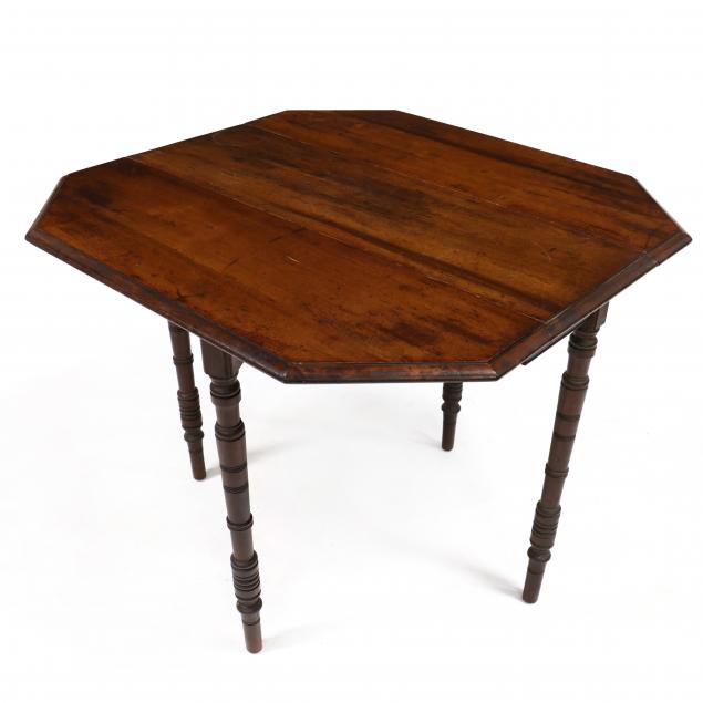 Early 20th century, rectangular top, drop leaves with molded edge and cut corner, ring turned and tapered legs.