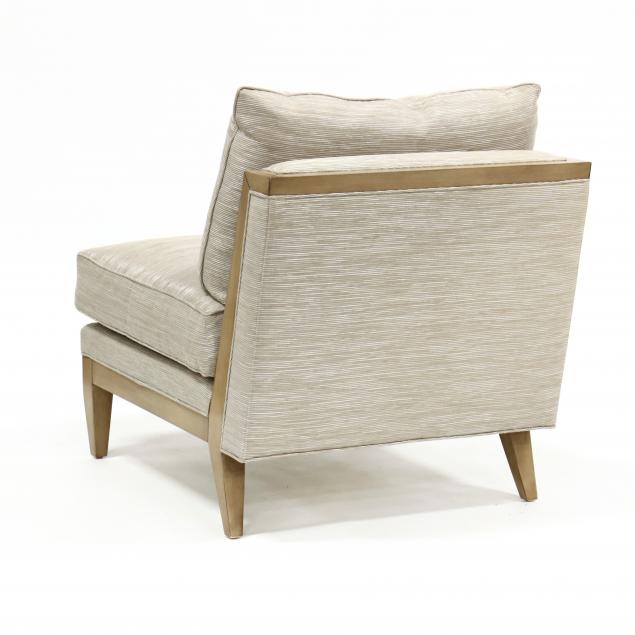 Lacquered wood frames with silvery upholstery, loose seat cushions on square tapered legs, labeled.