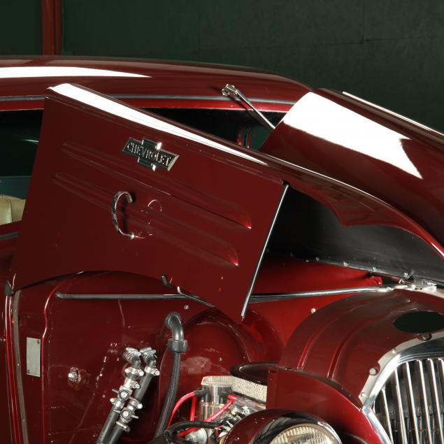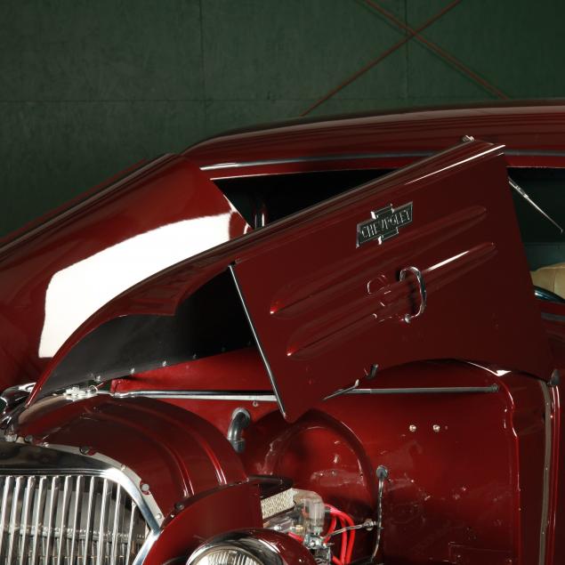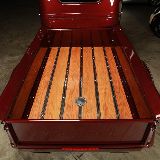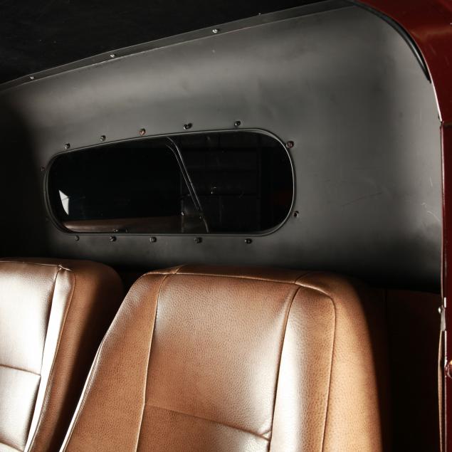 The exterior body was sprayed with 6 coats of base paint in LIMCO Dark Cherry Pearl, and finished with LIMCO clear. The mostly original body was retained, with only the rear fenders and running boards replaced. Fiberglass replica parts were used. All parts were painted off of the body. The interior is finished nicely with aftermarket gauges fitted to the dash, and a later steering column. The seats and door panels are covered in Ostrich hide and are very comfortable. Both front seats are adjustable. The fuel tank was relocated from behind the seats, and resides under the bed.