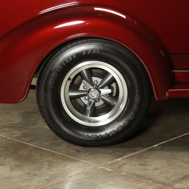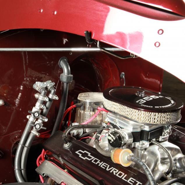 with a professionally built 355 cubic inch Pro Street Chevy small block, balanced and blueprinted with custom machine work, performance developed heads and Keith Black pistons with forged internals. Manufacturer claims 420 horsepower produced. with a Th350 Turbo 3-speed transmission with a 2800rpm stall converter and a 10 bolt rear end (final ratio unknown). It has a very aggressive cam, and and with the Magnaflow exhaust, it sounds wonderful. The front end was sourced from a Camaro and provides power steering, a more modern suspension, and vented front disc brakes. The rear is fitted with leaf springs and disc brakes.