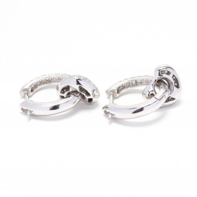 In a hinged hoop design with suspended heart charm and pavè set with full cut round diamonds weighing approximately 1.25 total carats (G-H color, VS-SI clarity), stamped 750 and with partial maker's mark.