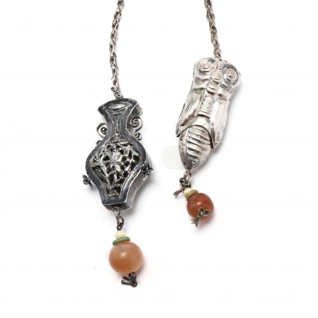 Late 19th century; including one in the form of a cicada, (2) with reticulated cases, and one vasiform cloisonne case; with decorative charms.