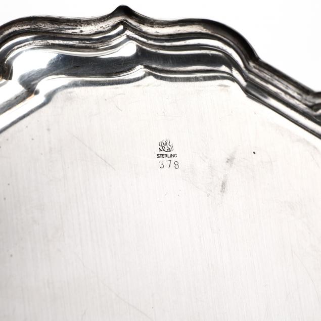 (16) pieces, to include: small round tray with shaped rim edge, mark of Frank W. Smith Silver Co., model number 378 (8 in.); five piece set of engraved liquor label plaques with chain, marked "Sterling / -W-" to reverse (2 x 1/2 in.); (7) footed cordials, each marked "Sterling" (3 1/8 in.); double-sided jigger, mark of J.C. Boardman & Co. (4 1/4 in.); R. Wallace & Sons tongs, with pierced bowl and handle (6 5/8 in.); footed waste bowl with weighted base, mark of Revere Silversmiths (2 3/4 in.). All without monograms.