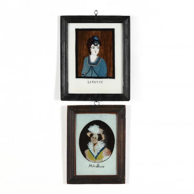 Each a reverse glass painting housed in antique framing with bails for hanging, circa 1900, with names "Lizette" and "Holenderin" beneath each portrait.