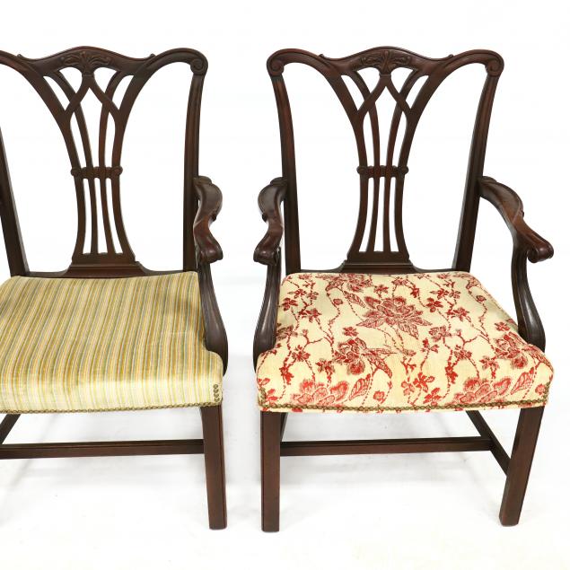 First half 20th century, Tomlinson Furniture, solid carved mahogany frames, including two armchairs and eight side chairs, over upholstered seats in varying upholstery with brass nail head trim, on straight molded legs with stretcher base, labeled.