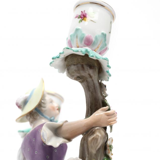 Mid-19th century, model 72 #1130, a girl sitting on forked branches entwined with flowers, each terminating in a candle cup, gilt decorated earth base with leaf rocailles, underglaze blue crossed swords.