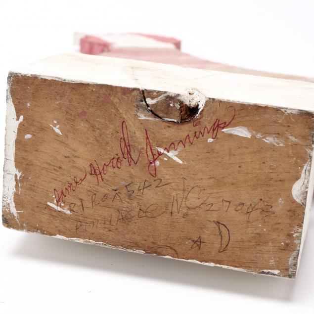 An assemblage of cut-out painted wood creating a scene of a lady playing a banjo with chicken and boy, standing on a rough piece of cut wood, a pointing finger to the left and an alligator to the front, signed on the underside in ink (11 x 13 in.); the second cut-out is a large chicken in profile, also signed on the underside and with Jennings address written in pencil (16 x 17 in.).