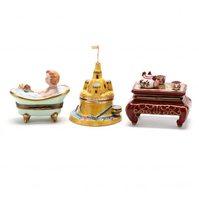 Made in France, (4) in the Asian taste; a seated leopard (4 1/4 in.;) a sand castle (3 3/4 in.); hyacinths in a pot; pheasant; child in bath (2 1/2 x 2 3/4 in.)
