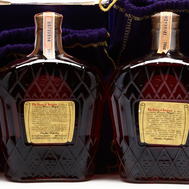 NV, Seagram\'s Crown Royal Canadian Whisky, Joseph & Seagram & Sons Limited, Waterloo, Ontario, Canada, 40%, 1968 bottling, 1hs, 1htms, 2 sealed, includes 2 purple velvet bags & 2ocb (2 Quart)