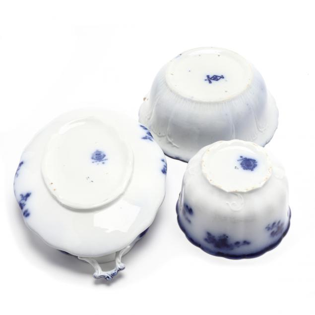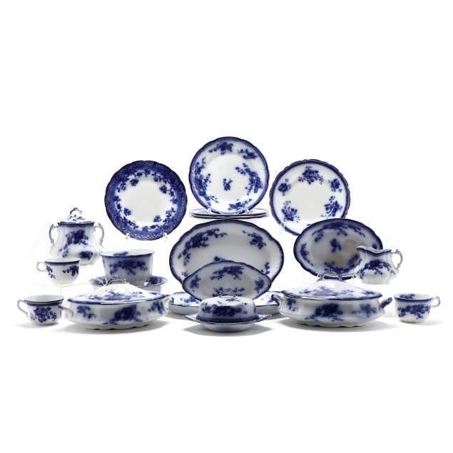 Marechal Niel by W.H. Grindey, 189, (5) luncheon plates (9 in.) (one with edge chips); (6) saucers (one tiny flea bite); (2) cups; a creamer; a covered sugar (6 1/2 in.); waste bowl (interior scratching); (2) platters (larger 14 1/2 in.); relish dish; vegetable dish (interior browning); butter dish, covered and with insert; (2) covered entree dishes (one with edge chip). Total (32); Three other pieces, one in