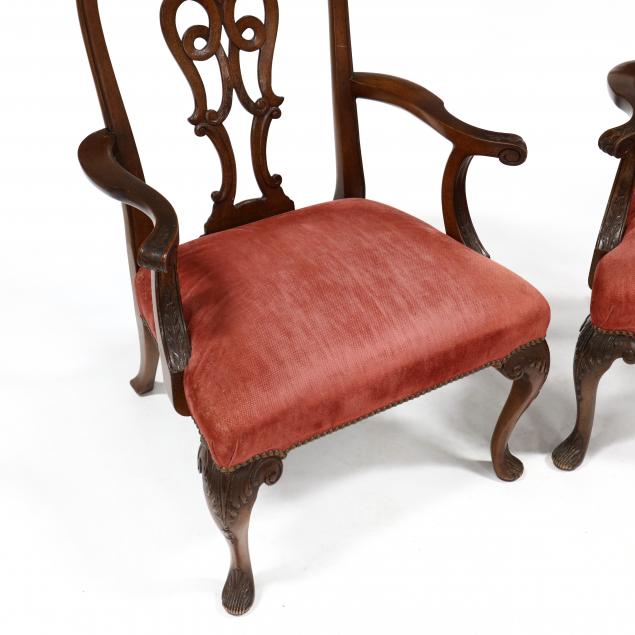 Late 20th century, shaped and acanthus carved crest rail, pierced and carved back splat, scrolled arms with carved foliate, over-upholstered seats with brass nail head trim, front cabriole legs with acanthus carved knee and foliate pad feet.