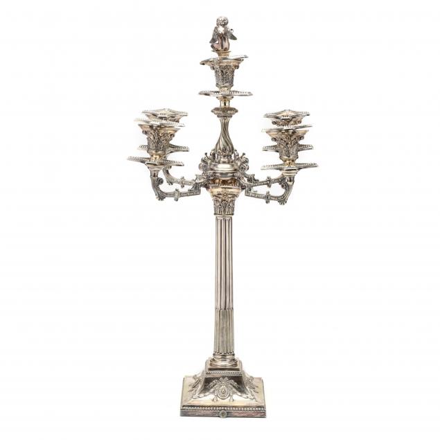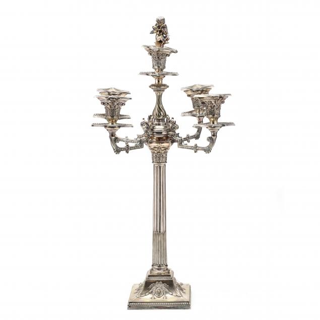 19th century, convertible form, Corinthian capitals with removable shaped bobeches on a central fluted column, the molded pedestal base is weighted, the sides of which with oval floral medallions and laurel garland, all over beaded border edges, and putti snuffer.