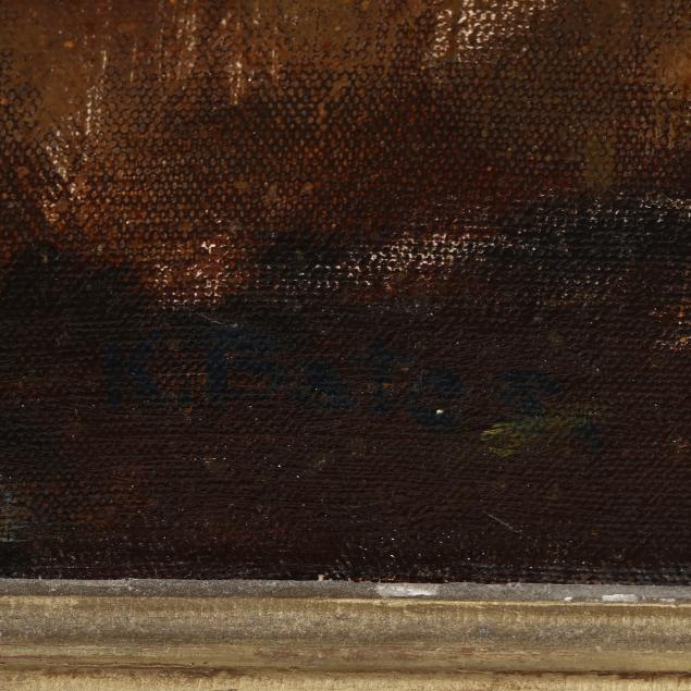 Oil on canvas, twice inscribed to verso "Young Men and Horses / Kenneth Bates," retains two exhibition labels to verso (the first label for the Allied Artists of America 1933 and with hand-written note indicating it was recieved too late for inclusion; the second label for the Corcoran exhibition), presented in a period carved and gilt frame.