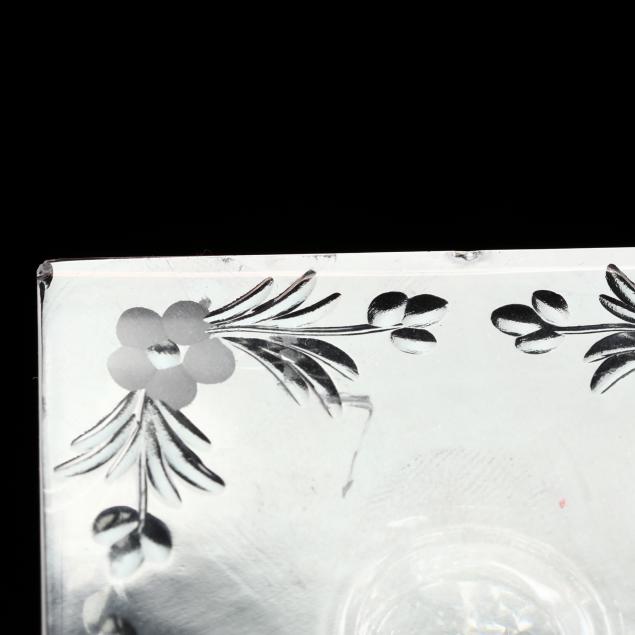 Brilliant Period, finely wheel cut with blooms and buds, tapered panel stem with notched edges, square foot with underside engraved flowering vines, marked "Hawkes" to the top edge of the foot.