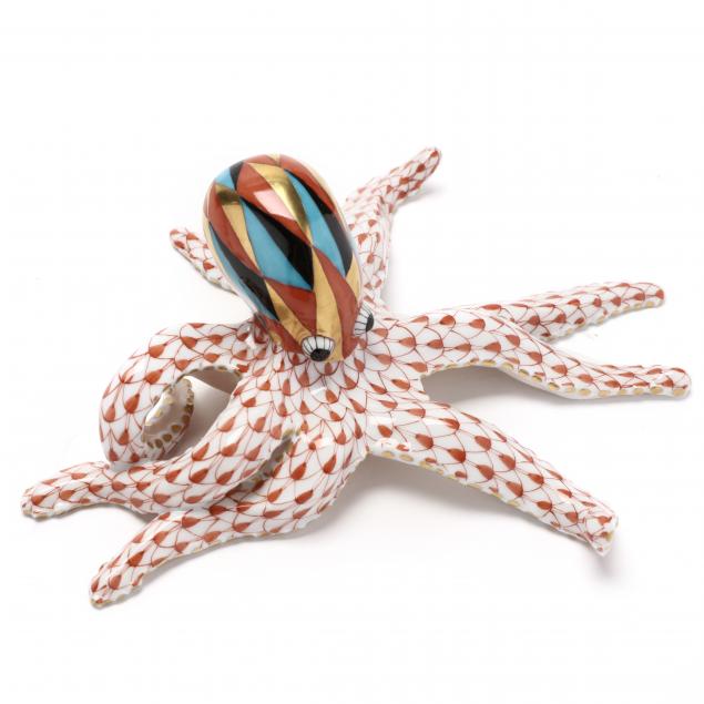 Rust fishnet, to include: a Foo Dog on pedestal #5303 (4 1/2 in.); a hedgehog; a grasshopper; an octopus #15664 (2 1/4 x 5 in.).