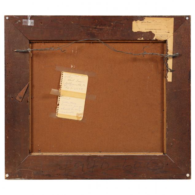 Oil on Masonite, signed and dated 1951 at lower right, retains remnants of a printed artist's bio and a hand-written label with the contact information for the artist's son (Bert Baum), presented in the likely original painted and reeded frame.