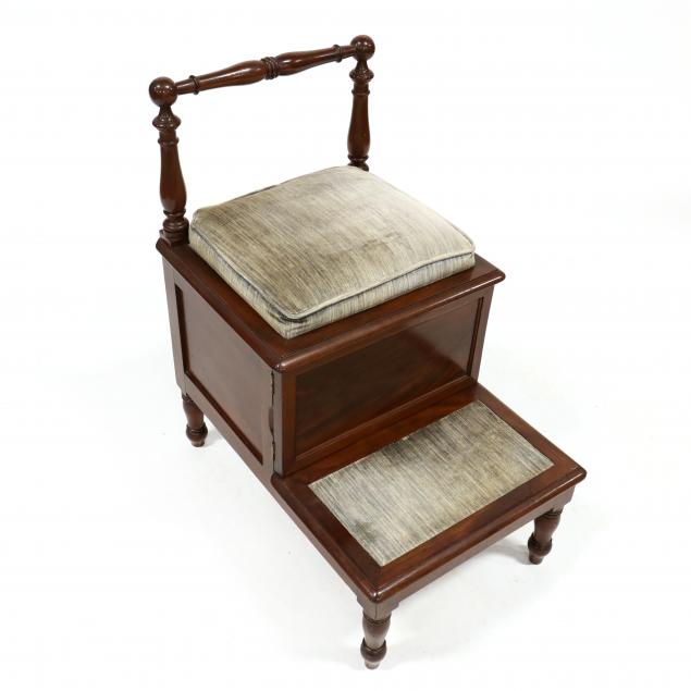 19th century, later upholstery with upper cushion over a hinged panel cabinet door, lower step with ring turned feet.