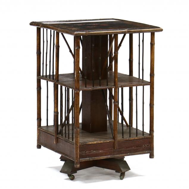 Late 19th century, Chinoiserie lacquered top with bamboo trim, spindles and stiles, two tiers in divided sections, rotating base, on casters.