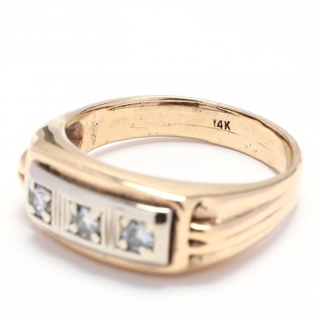 To include: a bi-color gold band, square setting to center with three full cut round diamonds weighing approximately .35 total carat (I-J color, SI-I clarity), stamped 14K (9.2mm; ring size 11.5); a white gold band with polished form, sides with ten flush set full cut round diamonds weighing approximately .12 total carat (H-I color, SI clarity), stamped 14K (6.1mm; ring size 9); and a white gold band set with (14) full cut round diamonds weighing approximately .21 total carat (I-J color, I clarity), stamped 10KSR (7.6mm; ring size 8.5).