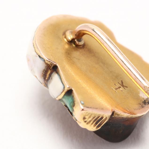 To include Art Nouveau stick pins: one in a Bedouin motif with enamel detailing, stamped 14K (2 3/8 in.); one in a Cleopatra motif with enamel detailing and gem-set accents, stamped 14K (2 5/8 in.); one in a King Tut motif with enamel detailing, testing 14K (2.5 in.); and one in a parrot motif with enamel detailing, testing 14K (2.25 in.); an Art Deco stick pin set with rubies and diamonds, testing 14KT (3 in.); and two Victorian stick pins to include one carved to depict The Fox and the Stork of Aesop's Fables, testing 14KT (3.25 in.) and one set with a cabochon garnet and old European cut diamond accent, testing 14KT (2.75 in.) (possible early solder repair).