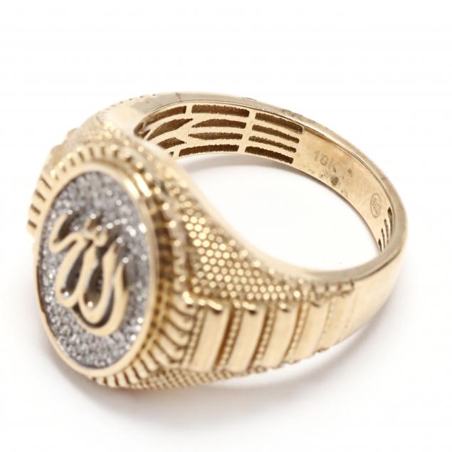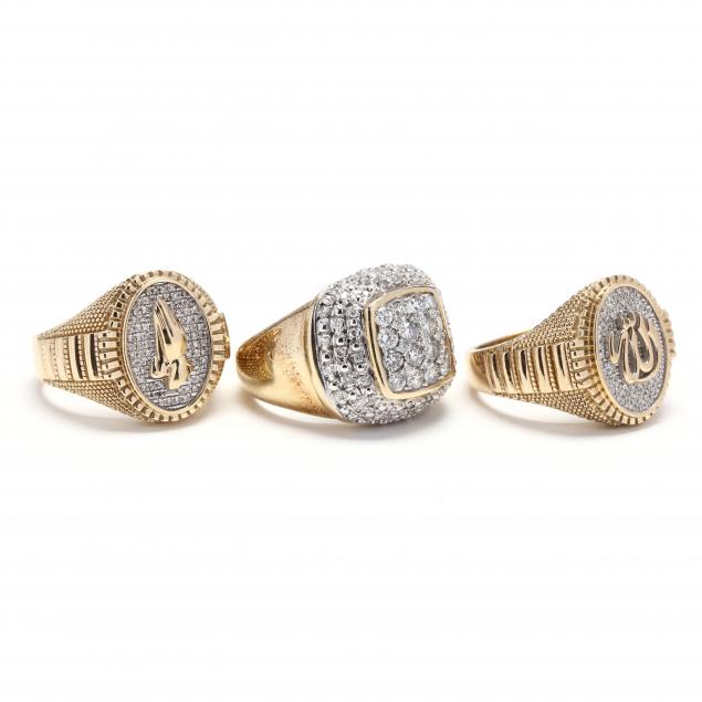 To include: a gold ring with central oval with pavé set diamonds weighing approximately .12 total carat (I-J color, SI clarity) and applied praying hands motif, stamped 10K with maker's mark aG (19.4mm; ring size 10.25); a gold ring with central oval with pavé set diamonds weighing approximately .10 total carat (I-J color, SI clarity) and applied Arabic lettering, stamped 10K with maker's mark aG (19.3mm; ring size 10); and a dome ring with pavé set diamonds, weighing approximately 2.35 total carats (I-J color, SI-I clarity), stamped 14K and with maker's mark AG (19.6mm; ring size 10.5).