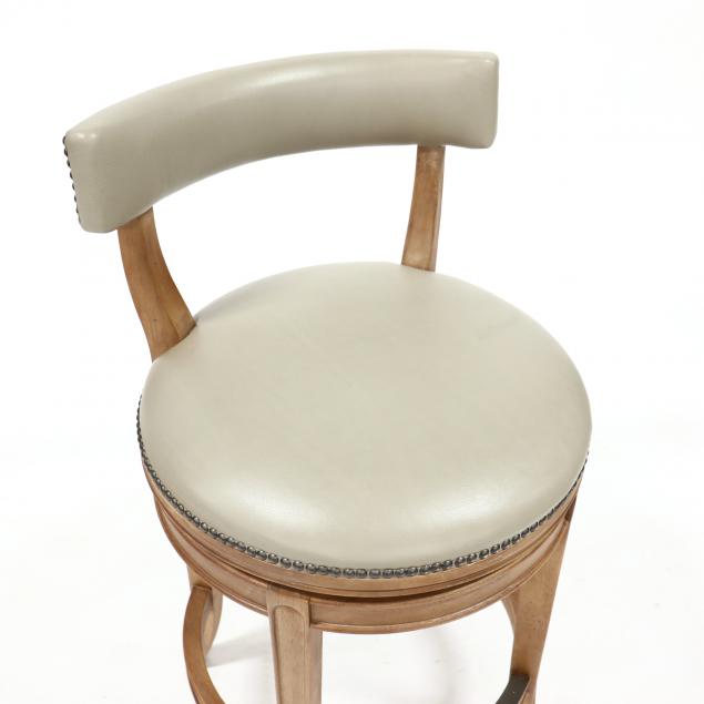 Contemporary, beige leather with gun-metal nail head trim on pickled mahogany frames, swivel seat, foot rail with metal trim, labeled.
