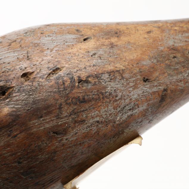 This extremely early shorebird decoy originally sold in the Mackey Collection Sale on July 10, 1974 as an "Early Virginia Snipe" decoy. Some believe this decoy was made by Lafayette Seabury (1823-1910) of Bridgehampton, Long Island. It is a full bodied shorebird and the gray paint appears to be original. It has a wonderful presence on the shelf.