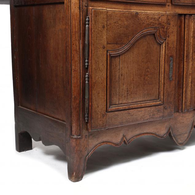 18th century, oak and pine secondary, rectangular top with molded edge and rounded front corners, three side-by-side lipped drawers, two hinged cabinet doors, the left door with attached center linenfold panel, each door with asymmetrical arched panel, steel hinges, paneled quarter columns, paneled sides, shaped skirt with molded edge, front short cabriole foot, straight rear legs.