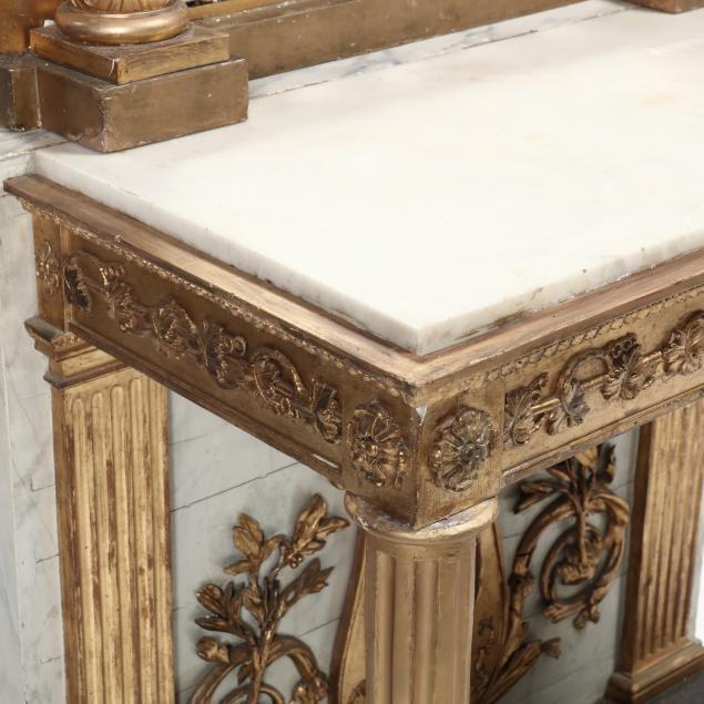 Staining and wear to marble top; gilt loss and chipping throughout; base back board with shrinkage cracks; other general touch ups and repairs throughout.