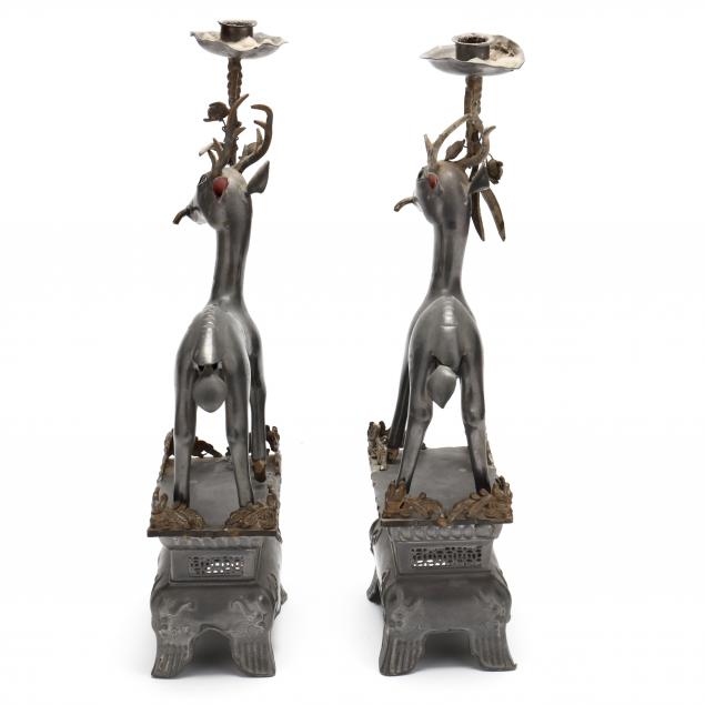 Late 20th century, each of a deer holding a shaped candlestick in mouth, mounted atop a Chinese style plinth with foliate gallery and pierced brocade patterns, four figural mask corners above a shaped skirt and bracket feet.