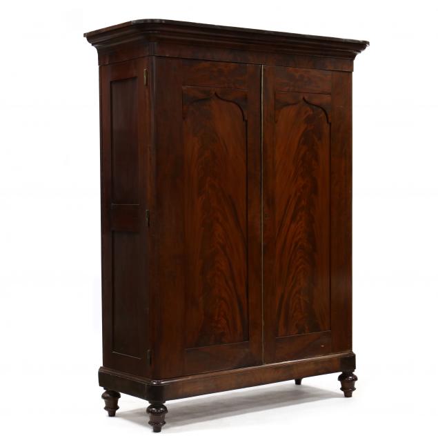 Attributed Baltimore, Maryland, circa 1830, mahogany veneer, poplar and white pine secondary, multi-part form, stepped and cove molded cornice above a vertically veneered book-matched frieze, two large hinged cabinet doors each with arched applied upper panel and highly figured burl veneers, rounded corners, the interior on the right side featuring four graduated flush mount drawers (each with high-grade burl veneers), the left side open, double paneled sides, molded base raised on four bold turned tapered feet.