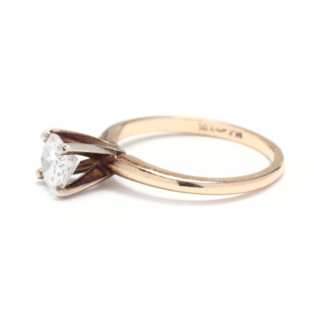 Centered on a round brilliant cut diamond, weighing approximately .70 carat (H color, SI1 clarity), stamped 14KT and with faint mark.