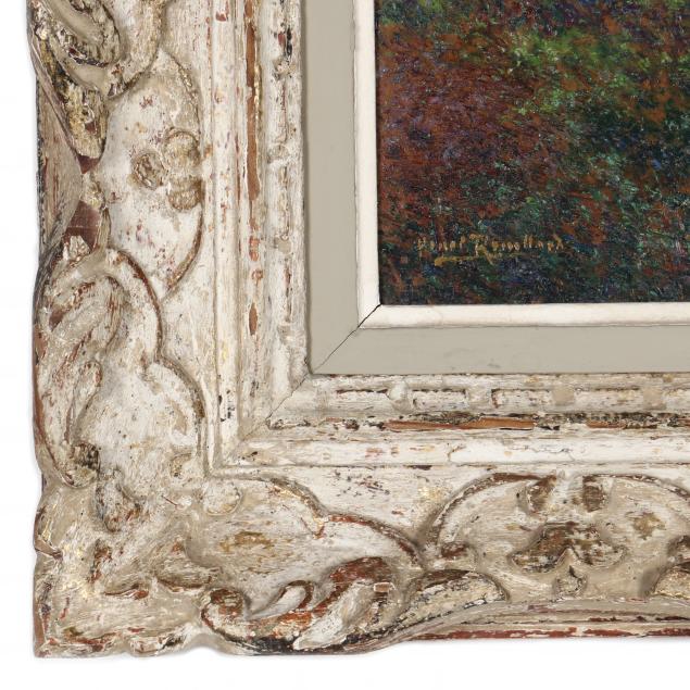 Oil on board, illegible signature at lower left (surname appears to be Rouillard), presented in a period carved and gilt wood frame with painted liner.