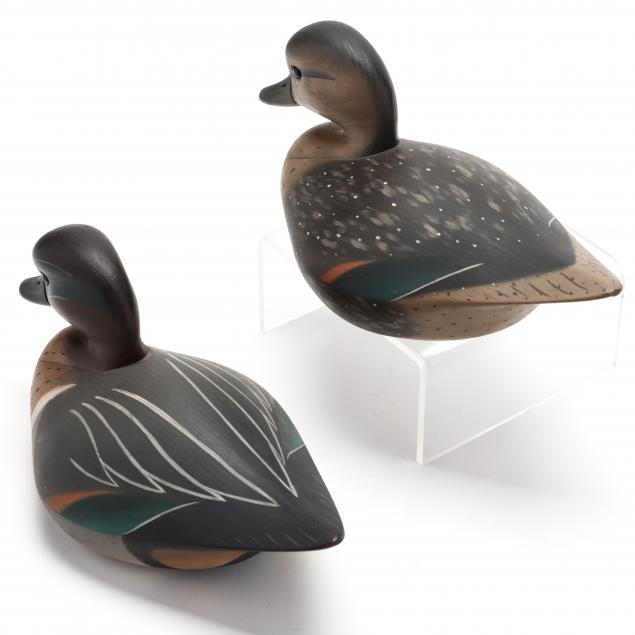 Pete Peterson, Cape Charles, Virginia. This stunning pair of diminutive teals have inletted heads and very attractive paint application. Pete carved these in 1989. Matched pair of PETE decoys are very difficult to find.