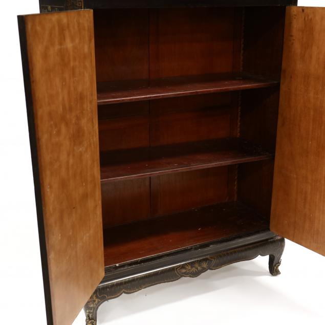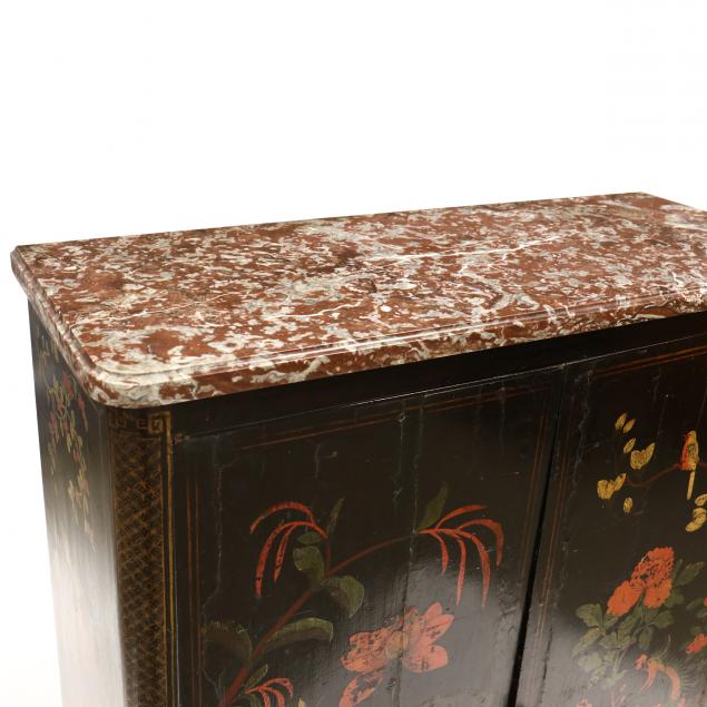 Circa 1900, rouge marble top with molded edge, the cabinet with all-over black lacquered field featuring polychrome Chinese decoration, shelved interior, short cabriole feet with ormolu mounts.