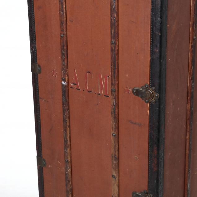 Model 146 (referring to 146 cm), 1910, composed of Vuittonite with leather trim and corners, specifically designed to hang 12-15 garments by a patented sliding trolly with jam, the hinged top opens to a satin lined box, brass hardware, Louis Vuitton label on the hinged top and on the inner wardrobe, as well as engraved on the exterior clasp. (A locker option on the door was available for the gent's model). Original key retained with the wardrobe.