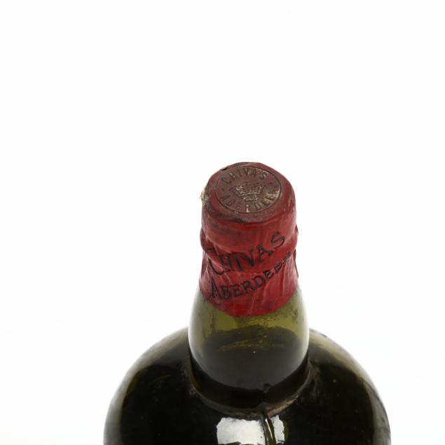 NV, Chivas Regal Blended Scotch Whisky (thought to be 25 Years Old), Aberdeen, Scotland, 40%-43.4%, thought to be early 20th Cent. bottling, 0.5cm below shoulder, missing labels, stopper cork stating Chivas Aberdeen on top, red lead capsule with Chivas Aberdeen printed on side, 3 piece moulded green glass dumpy bottle, sealed, thought to be 4/5 to 1 Q. (1 )