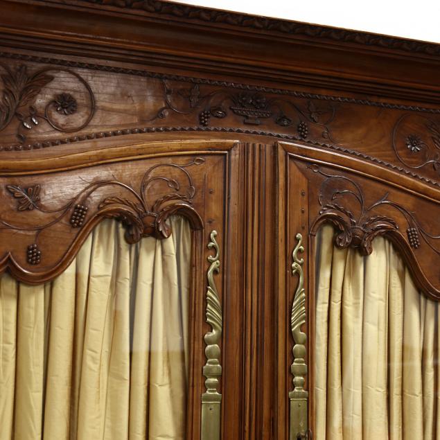 18th century, three part form, oak and mixed woods secondary, cove molded carved and stepped applied cornice, relief carved frieze with central carved urn/vine/berry motif, two hinged arched doors each with inset glass panel, relief carved surround with repeating motif and applied bold brass architectural escutcheons and hinges, double paneled sides, the base featuring a top board with molded edge above three side-by-side small drawers, each with chip carved panel, two large hinged raised panel doors featuring an asymmetrical carved foliate design, shaped and relief carved skirt with relief carved basket/vine/berry motif, paneled sides, raised on front whorl feet, straight rear feet.